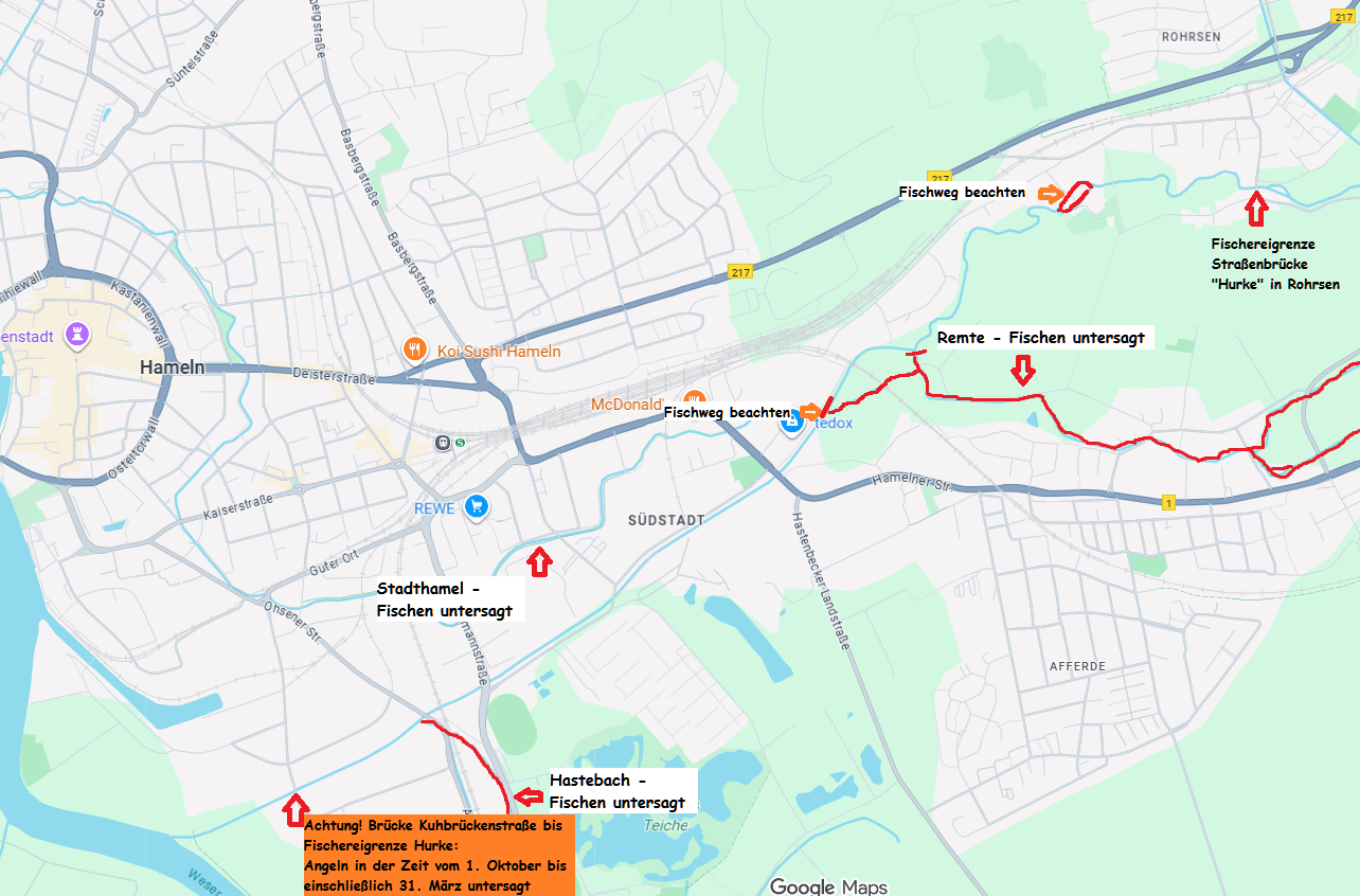 Die zu beangelnde Strecke beginnt somit am Lauensteiner Bach (Mündung am Sportplatz Salzhemmendorf) und endet an der Fischereigrenze unterhalb von Quanthof.